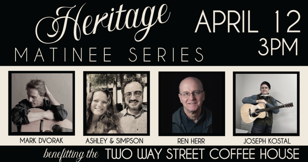 On April 12, 2026 the Two Way Street Coffee House is pleased to present Mark Dvorak, Ashley & Simpson, Ren Herr, and Joseph Kostal as part of our Heritage Matinee Series.